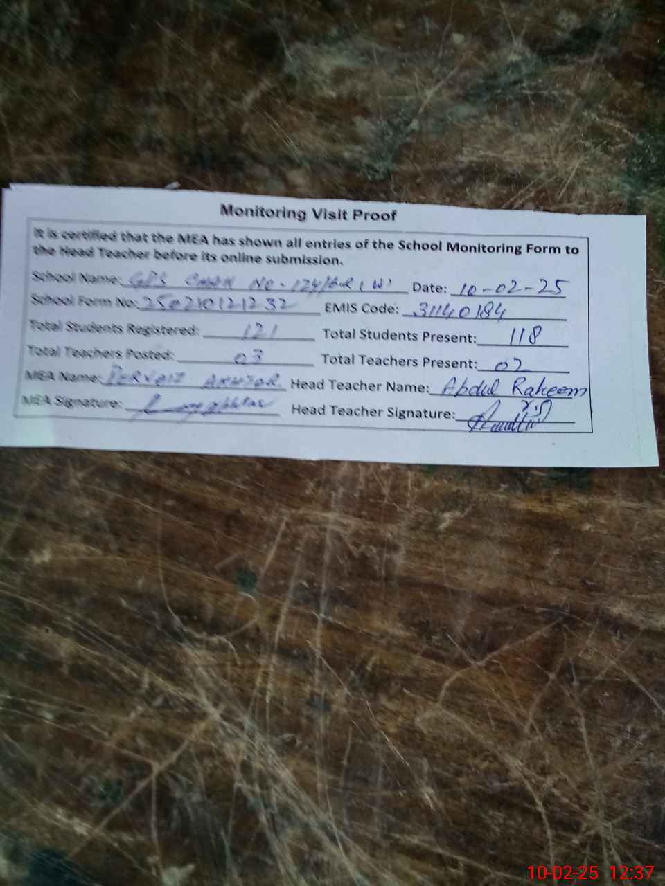 | Attendance Register | Head Teacher | MEA with School | Visit Proof |