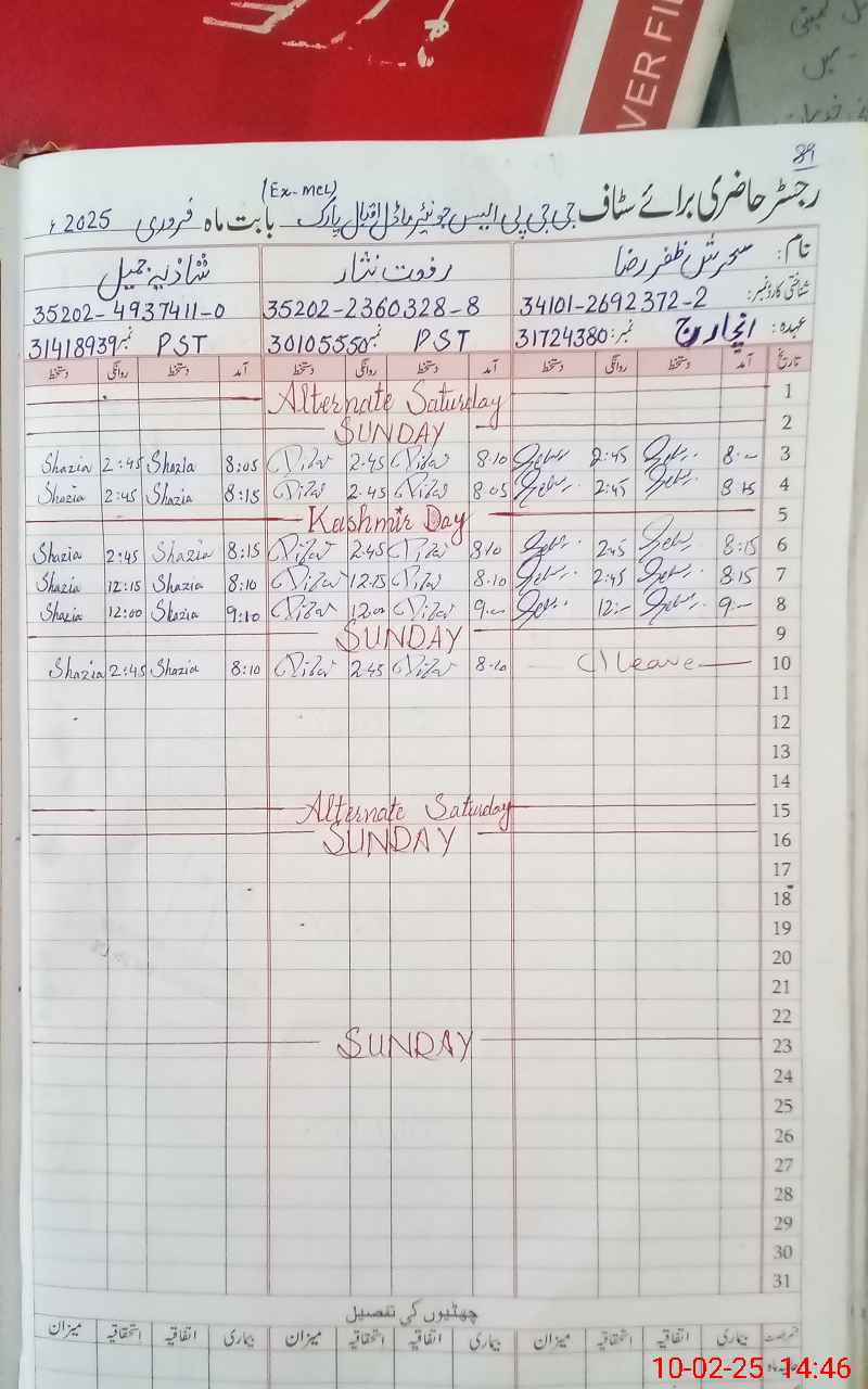 | CNIC | Full Name | Designation | R/C | Absence During Last Calender Month |