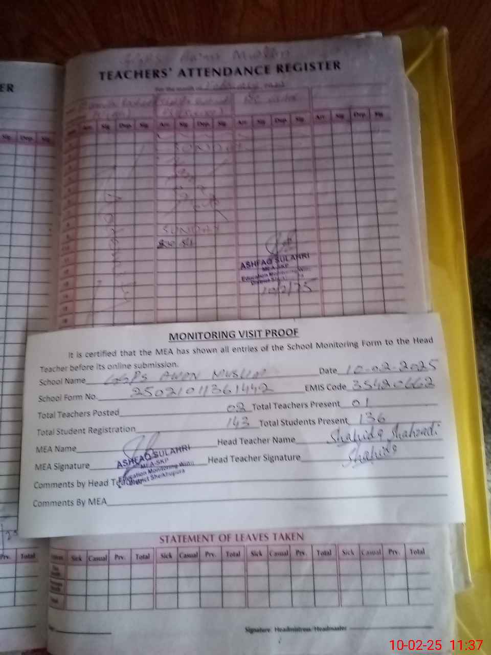 | Attendance Register | Head Teacher | MEA with School | Visit Proof |