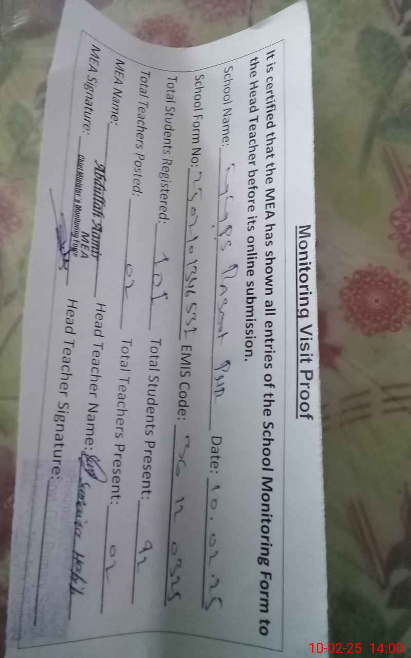 | Attendance Register | Head Teacher | MEA with School | Visit Proof |