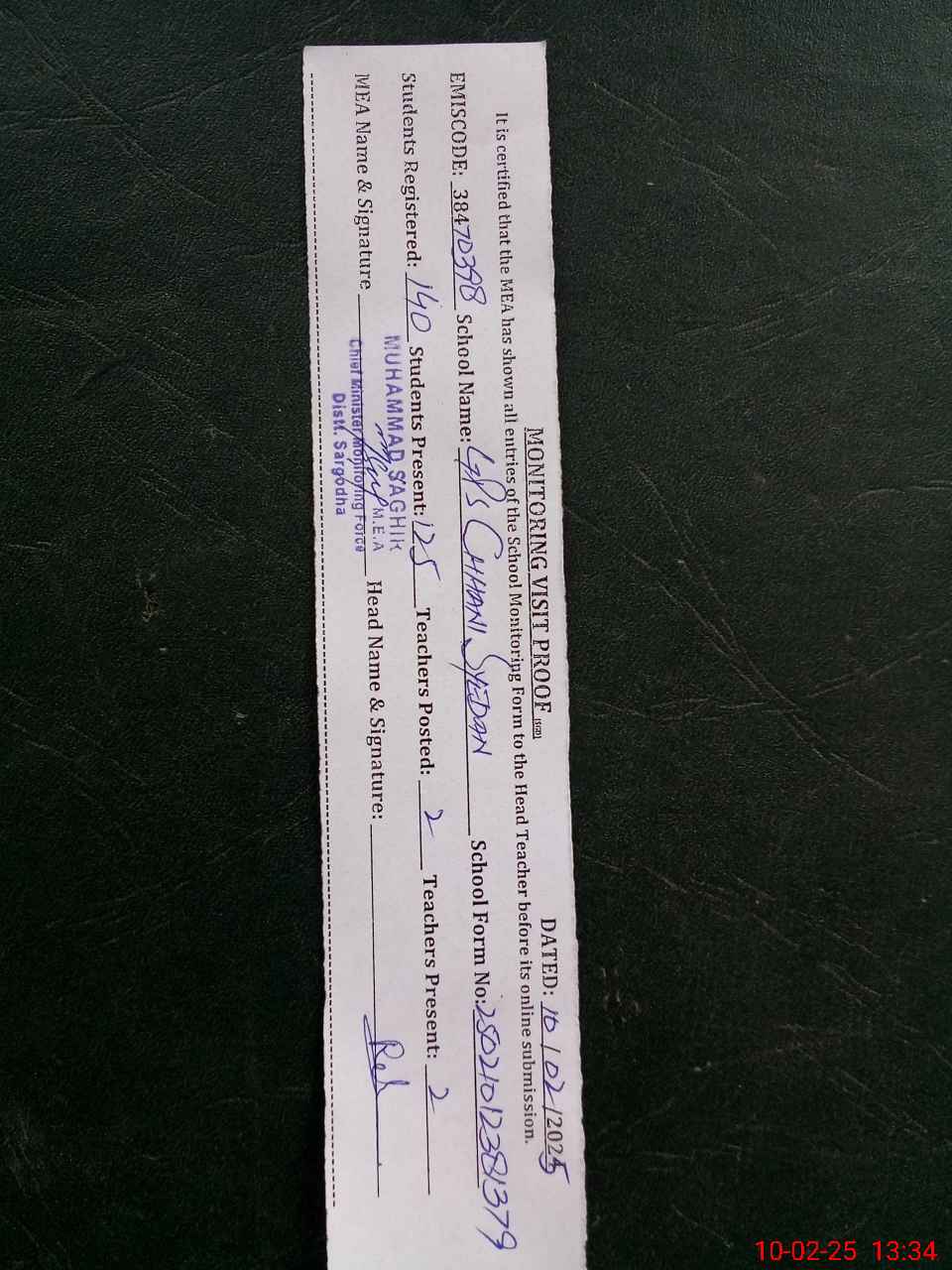 | Monitoring Date: 10-02-2025 | Start Time: 10-02-2025 12:38 PM | End Time: 10-02-2025 01:34 PM | Name of MEA: MU**** SA**** | |