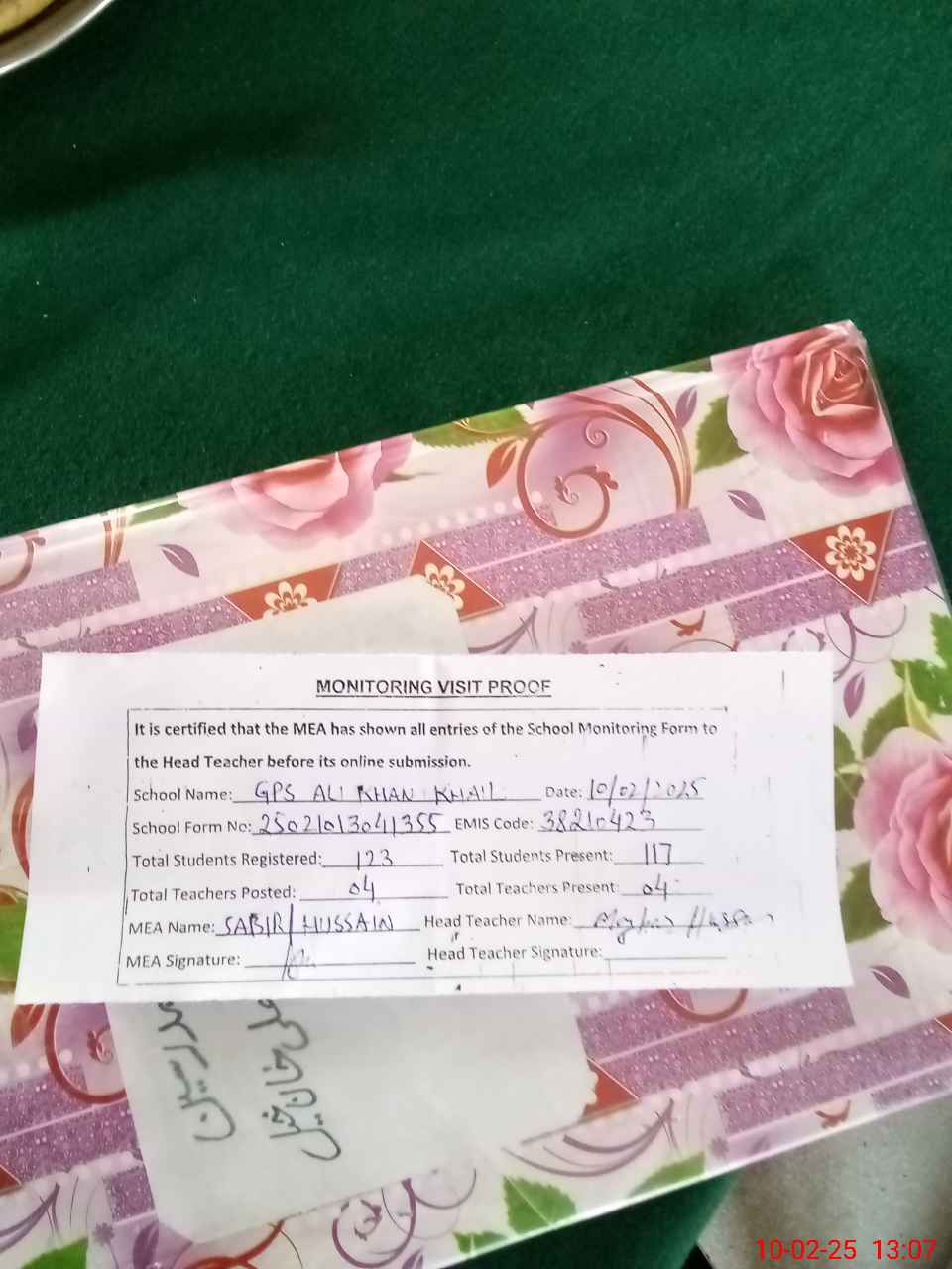 | EMIS Code: 38210423 | Name of School: GPS ALI KHAN KHAIL | |||
