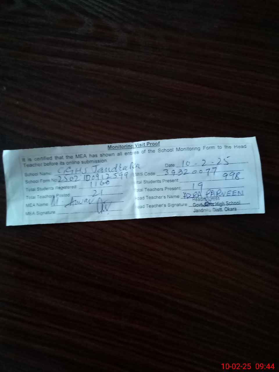 | Attendance Register | Head Teacher | MEA with School | Visit Proof |