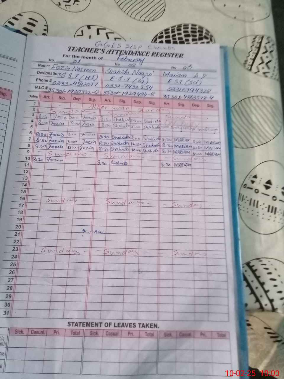 | CNIC | Full Name | Designation | R/C | Absence During Last Calender Month |