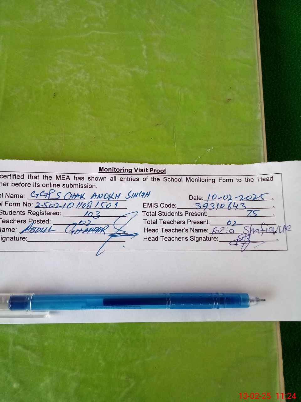 | Attendance Register | Head Teacher | MEA with School | Visit Proof |