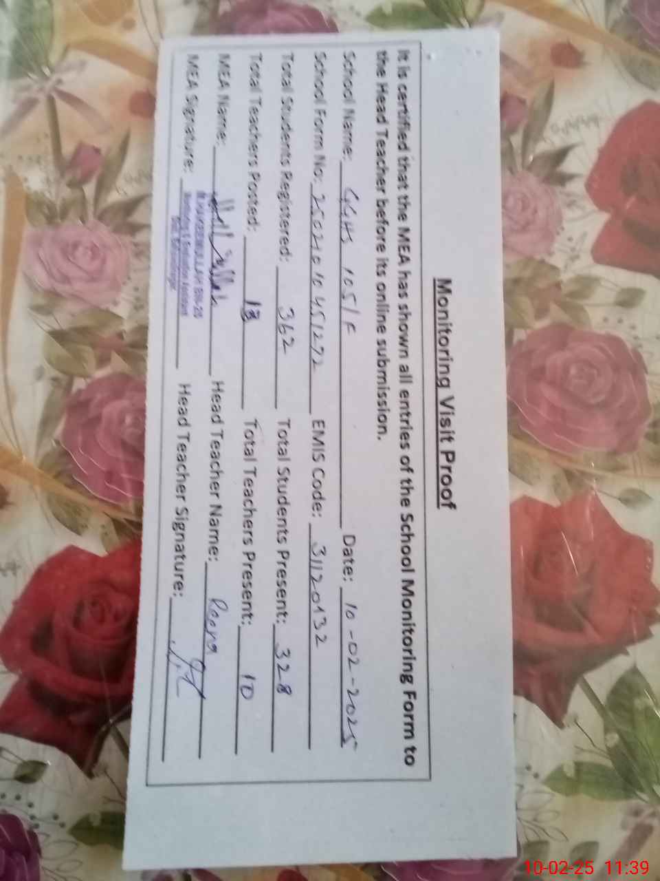 | Certified that this School was Inspected by the Undersigned MEA/DMO Today and the Information Stated Above is as Per Record. | |||||