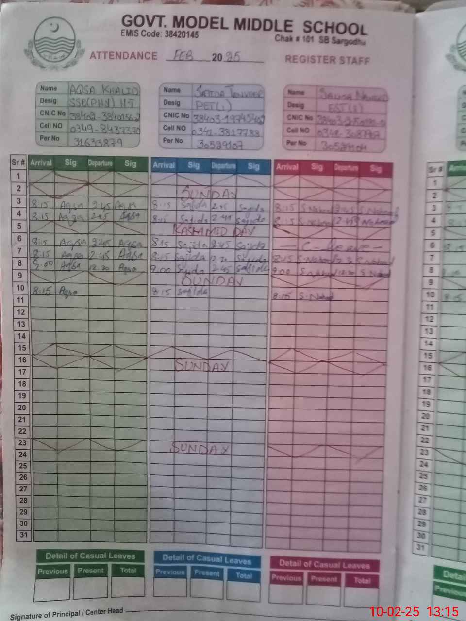| CNIC | Full Name | Designation | R/C | Absence During Last Calender Month |