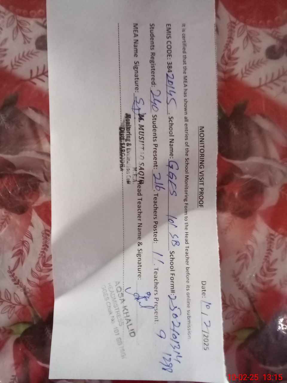 | Certified that this School was Inspected by the Undersigned MEA/DMO Today and the Information Stated Above is as Per Record. | |||||