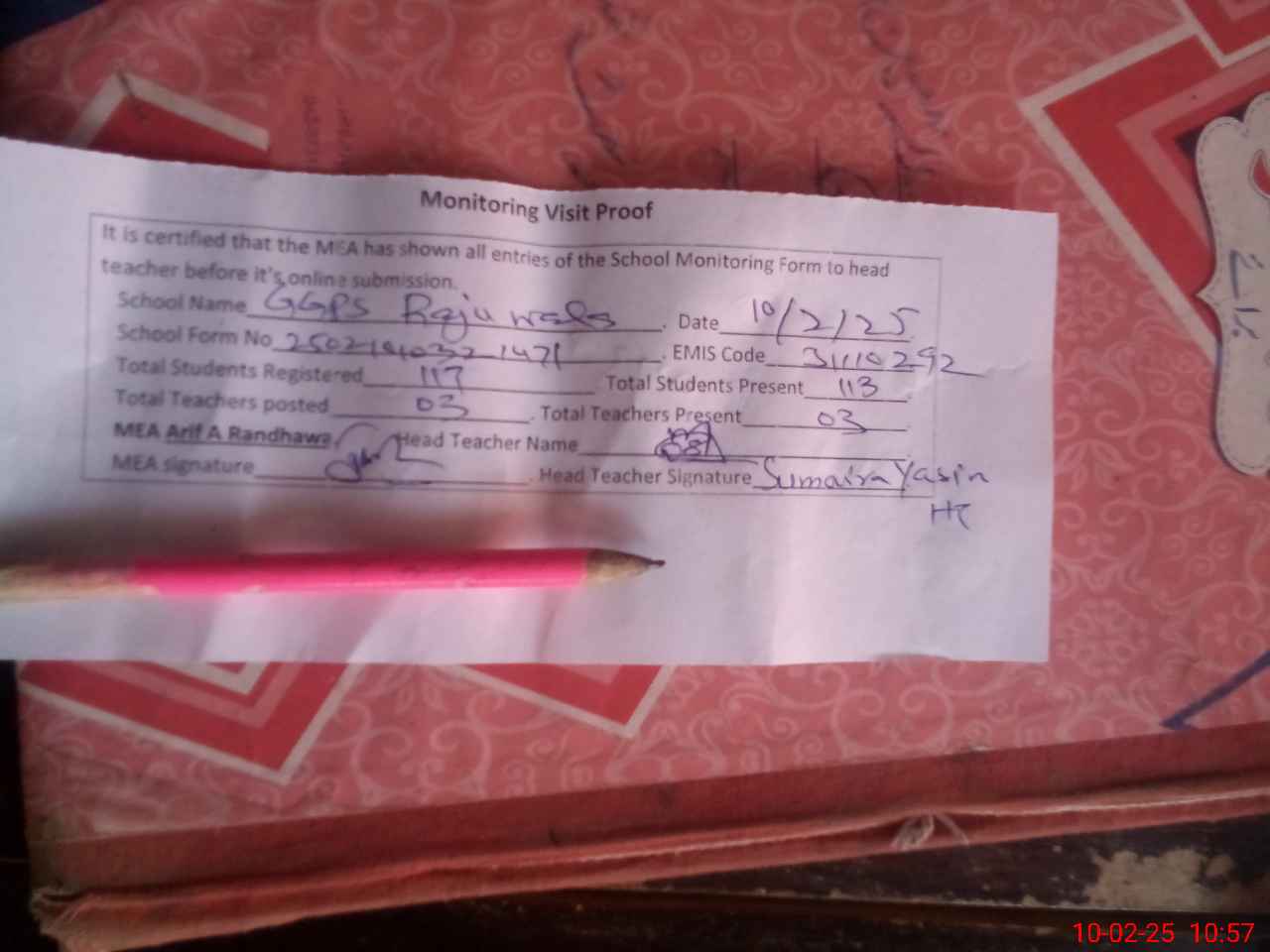 | Attendance Register | Head Teacher | MEA with School | Visit Proof |
