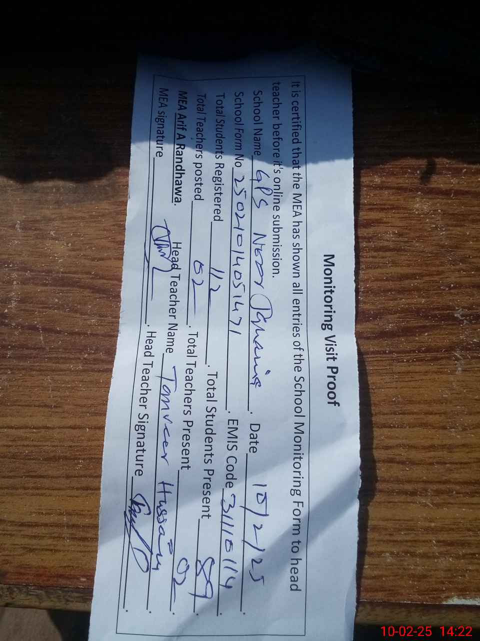 | EMIS Code: 31110114 | Name of School: GPS NOOR JAHANIAN | |||