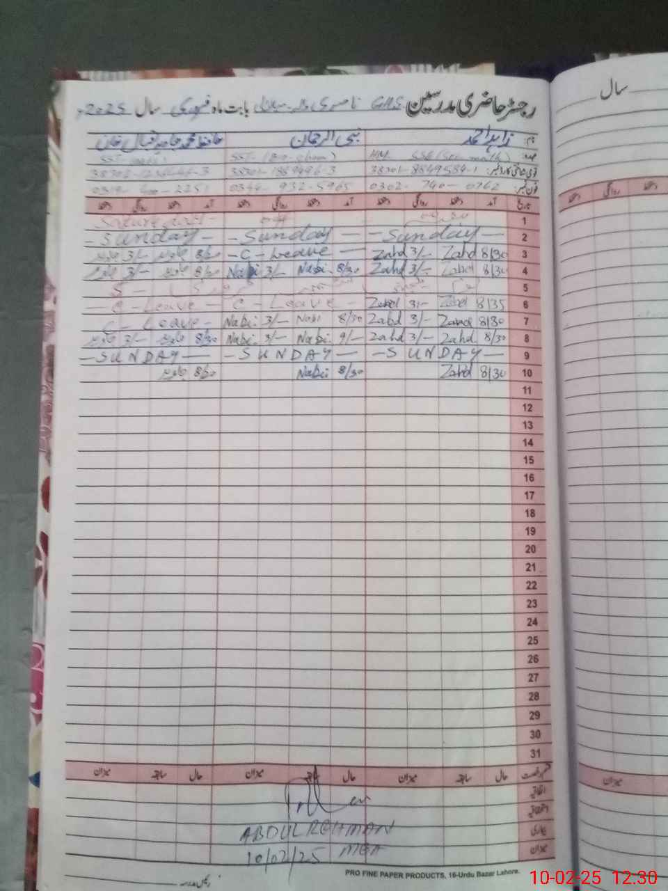 | CNIC | Full Name | Designation | R/C | Absence During Last Calender Month |