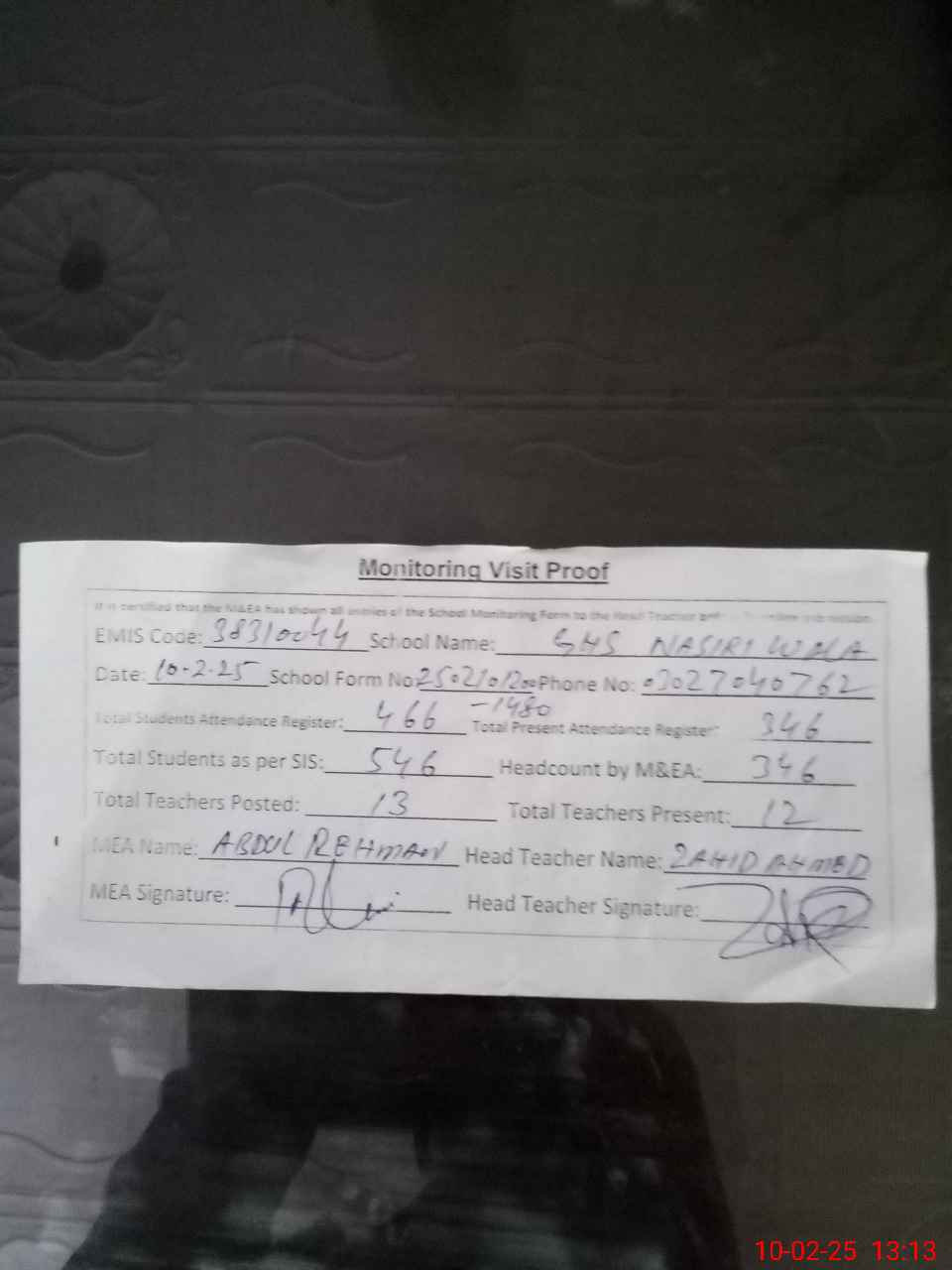 | Attendance Register | Head Teacher | MEA with School | Visit Proof |