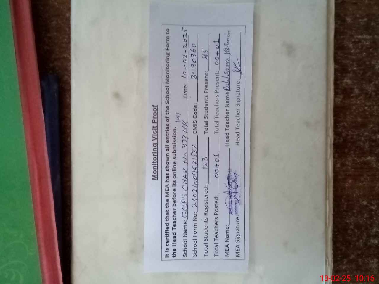 | Attendance Register | Head Teacher | MEA with School | Visit Proof |