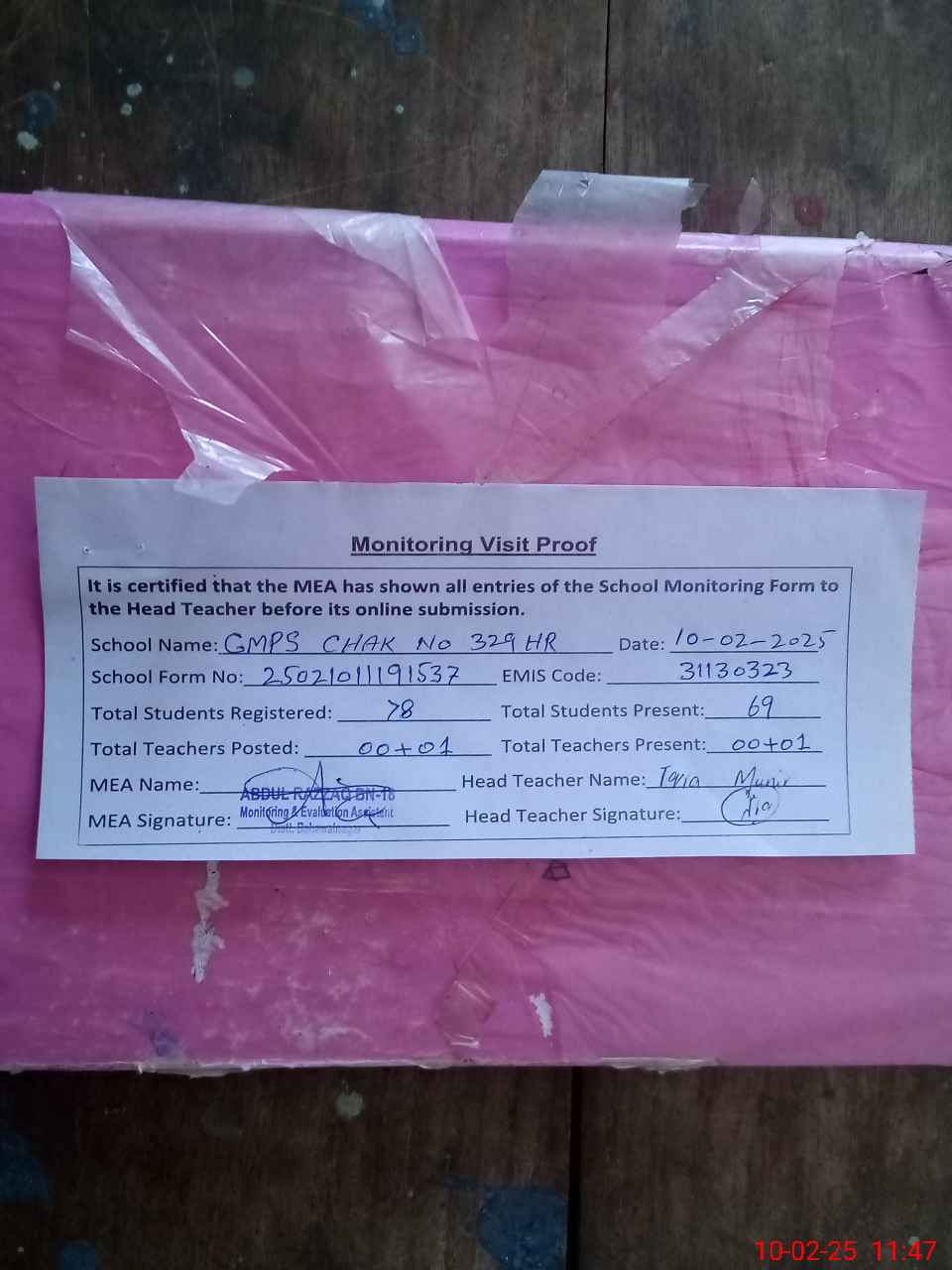 | EMIS Code: 31130323 | Name of School: GMPS CHAK NO 329 HR | |||