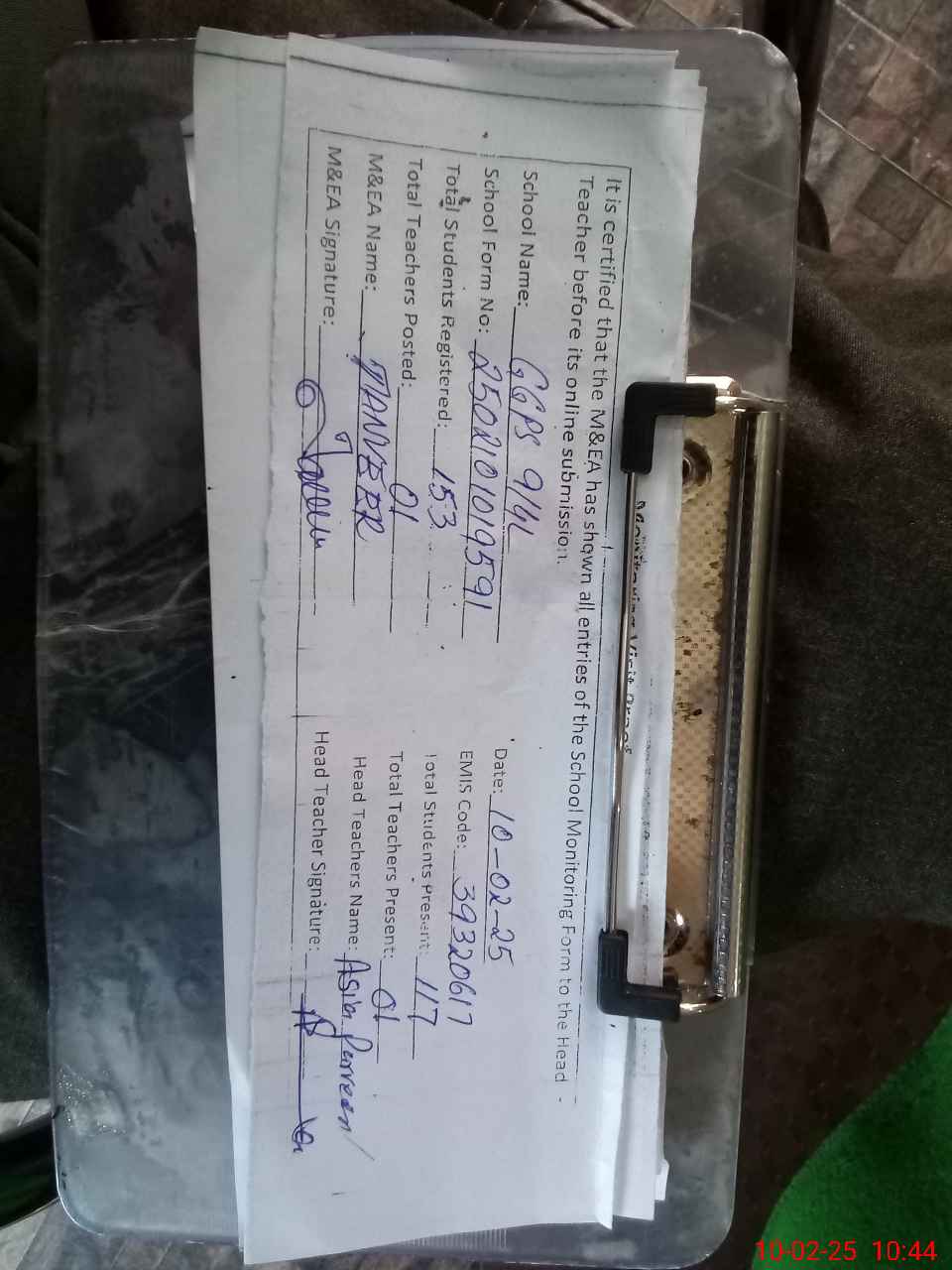 | Certified that this School was Inspected by the Undersigned MEA/DMO Today and the Information Stated Above is as Per Record. | |||||