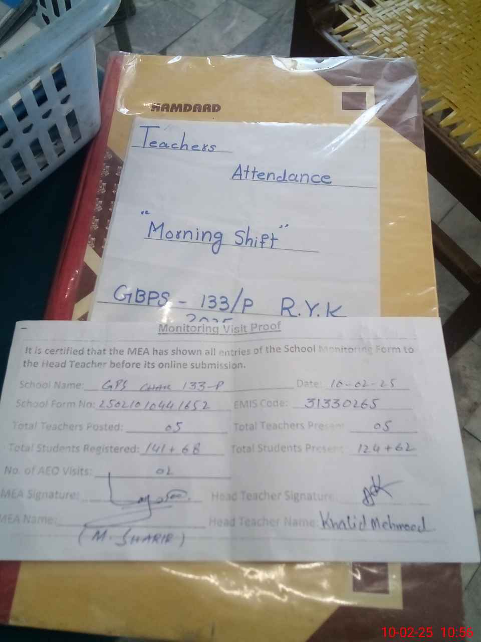 | Attendance Register | Head Teacher | MEA with School | Visit Proof |