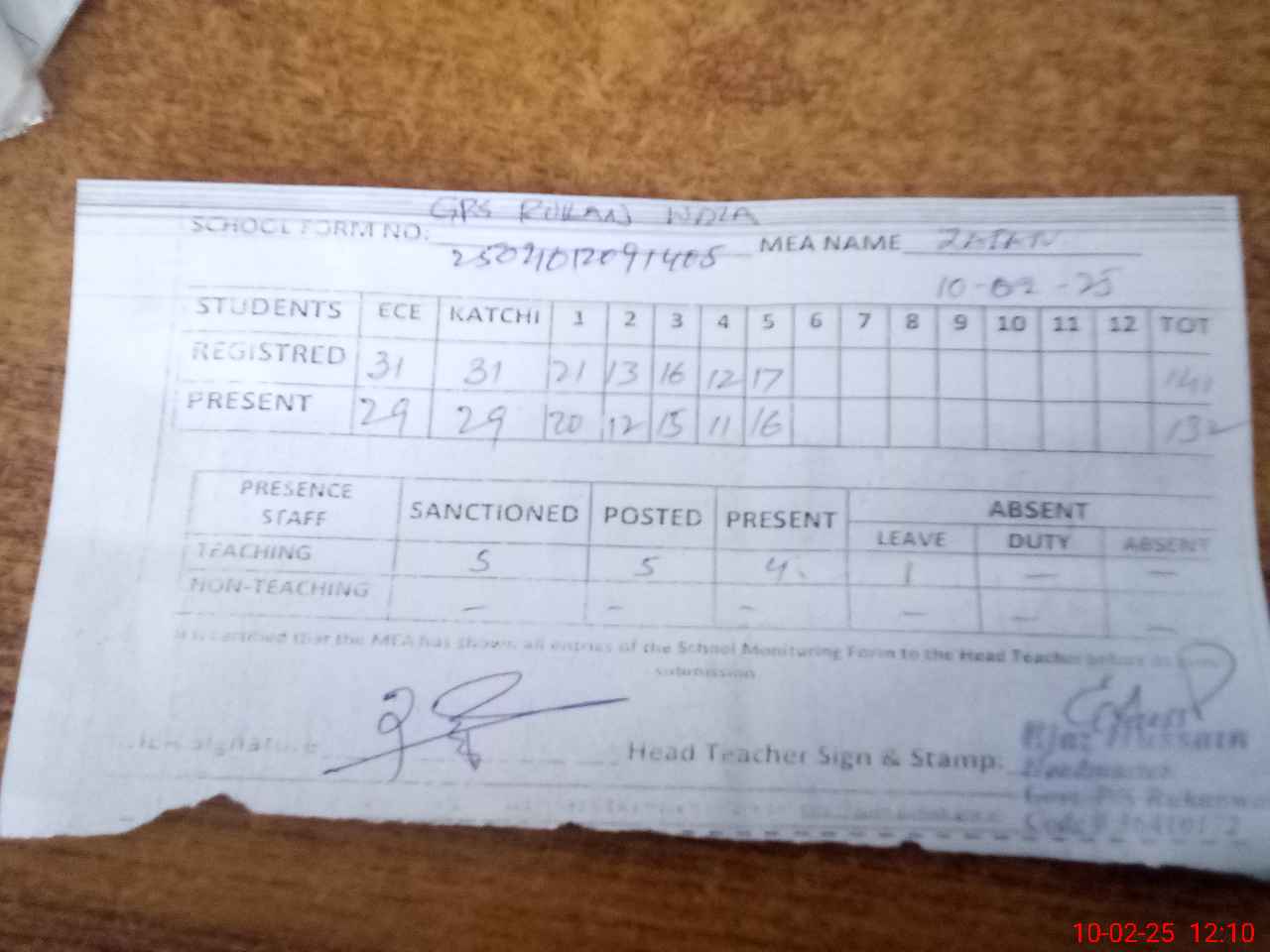 | Attendance Register | Head Teacher | MEA with School | Visit Proof |