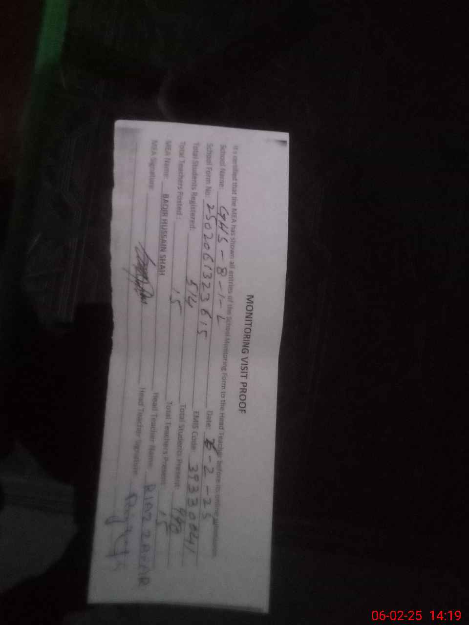 | Attendance Register | Head Teacher | MEA with School | Visit Proof |