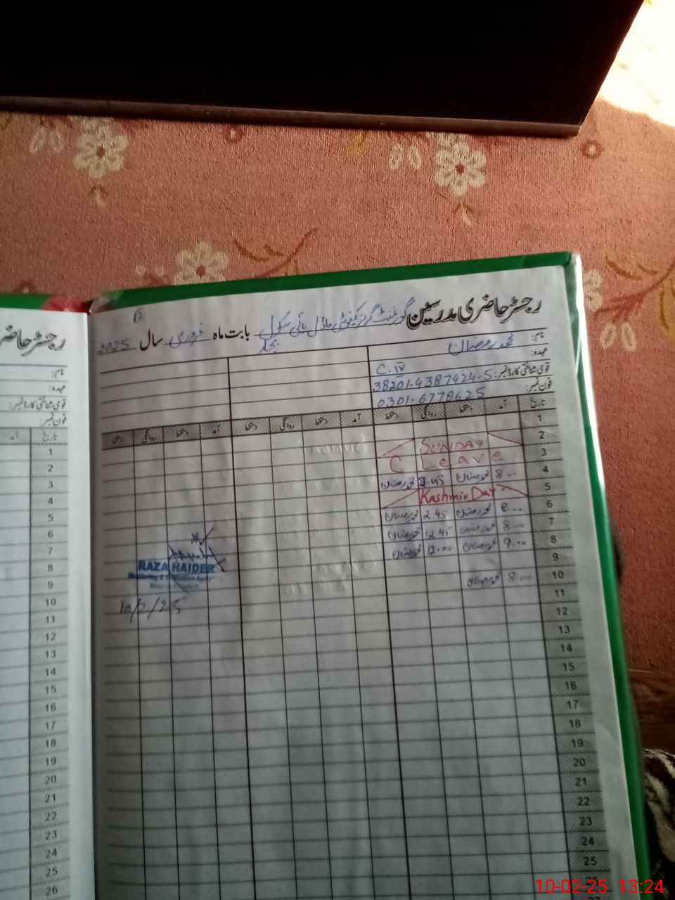 | CNIC | Full Name | Designation | R/C | Absence During Last Calender Month |