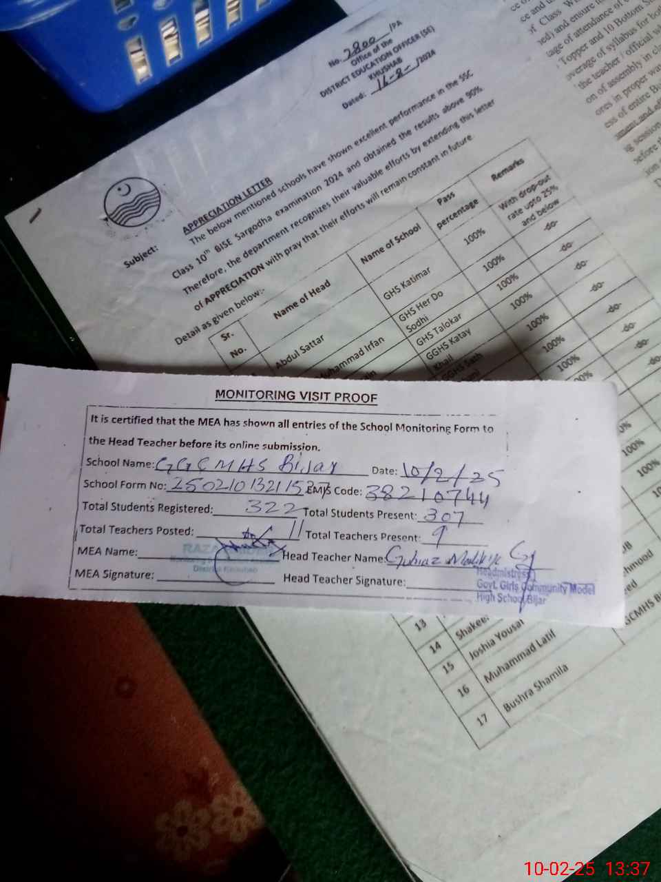| Certified that this School was Inspected by the Undersigned MEA/DMO Today and the Information Stated Above is as Per Record. | |||||