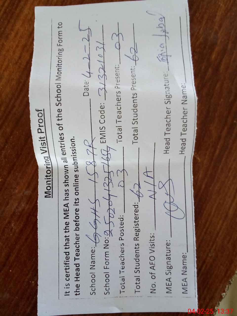| Attendance Register | Head Teacher | MEA with School | Visit Proof |