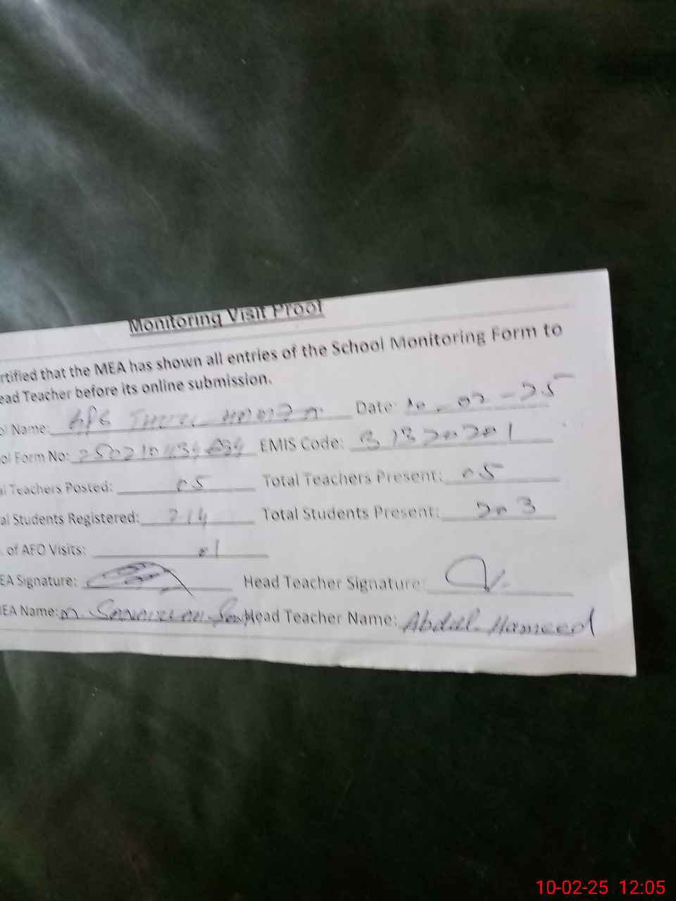 | Attendance Register | Head Teacher | MEA with School | Visit Proof |
