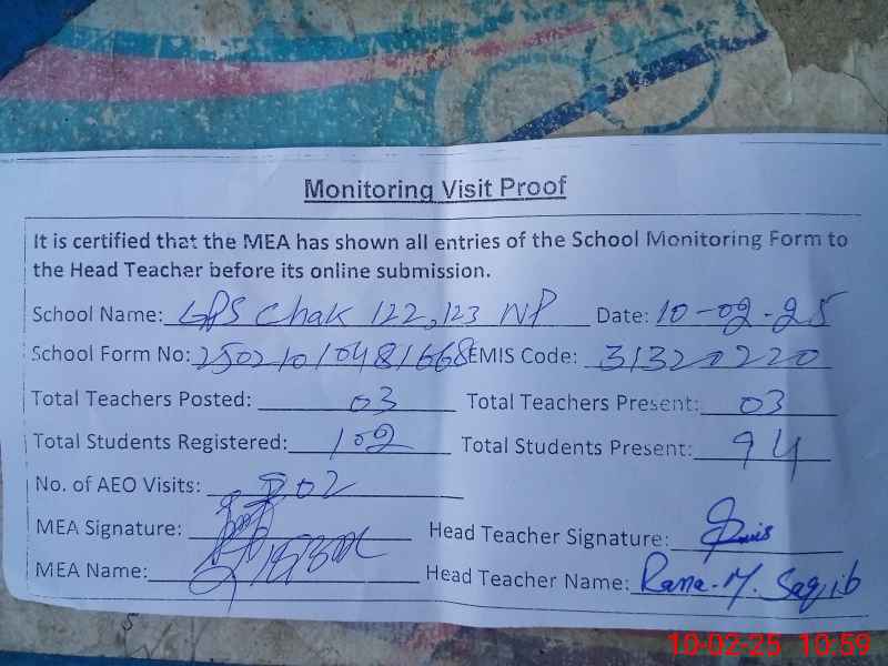 | EMIS Code: 31320220 | Name of School: GPS CHAK 122-123 NP | |||