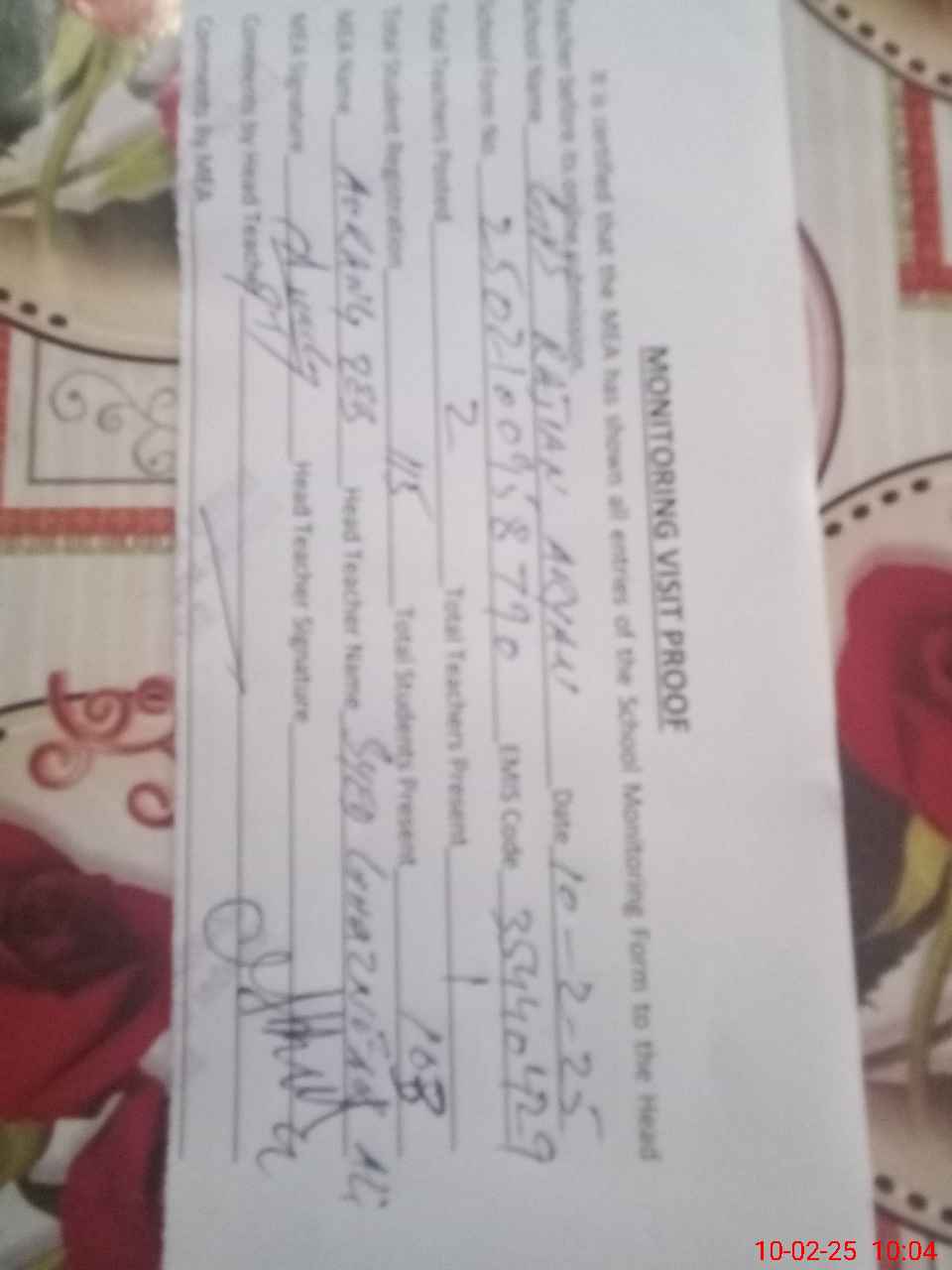 | Attendance Register | Head Teacher | MEA with School | Visit Proof |