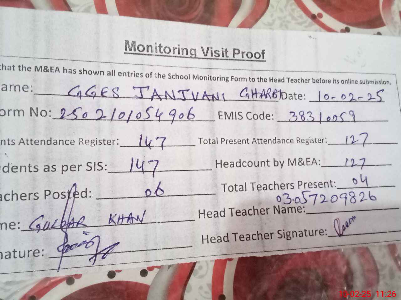 | Attendance Register | Head Teacher | MEA with School | Visit Proof |