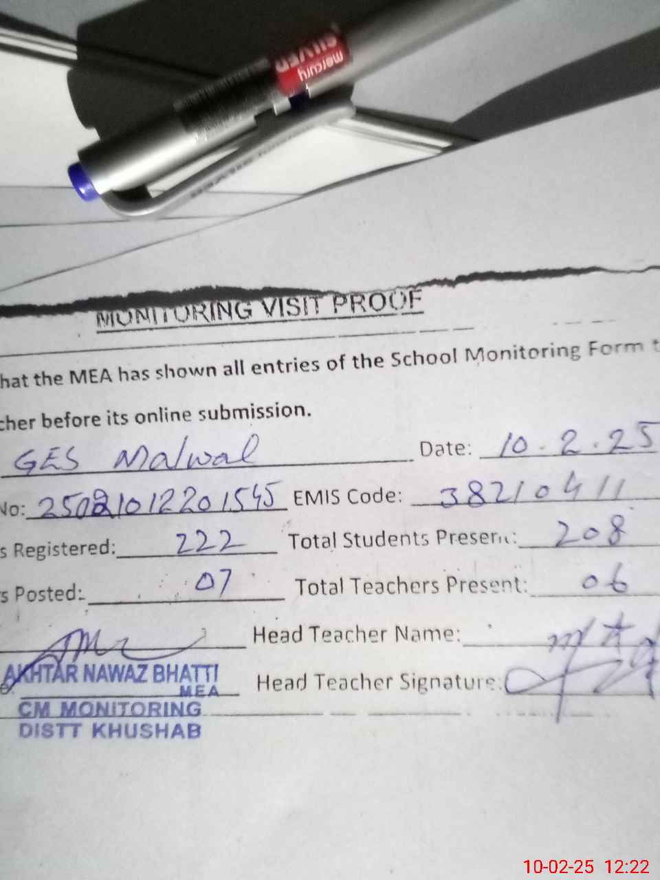 | Attendance Register | Head Teacher | MEA with School | Visit Proof |