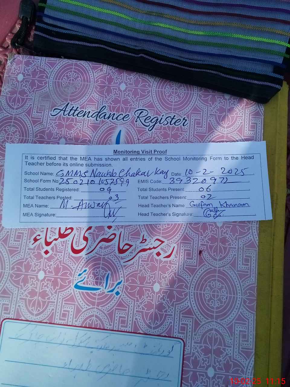 | Attendance Register | Head Teacher | MEA with School | Visit Proof |
