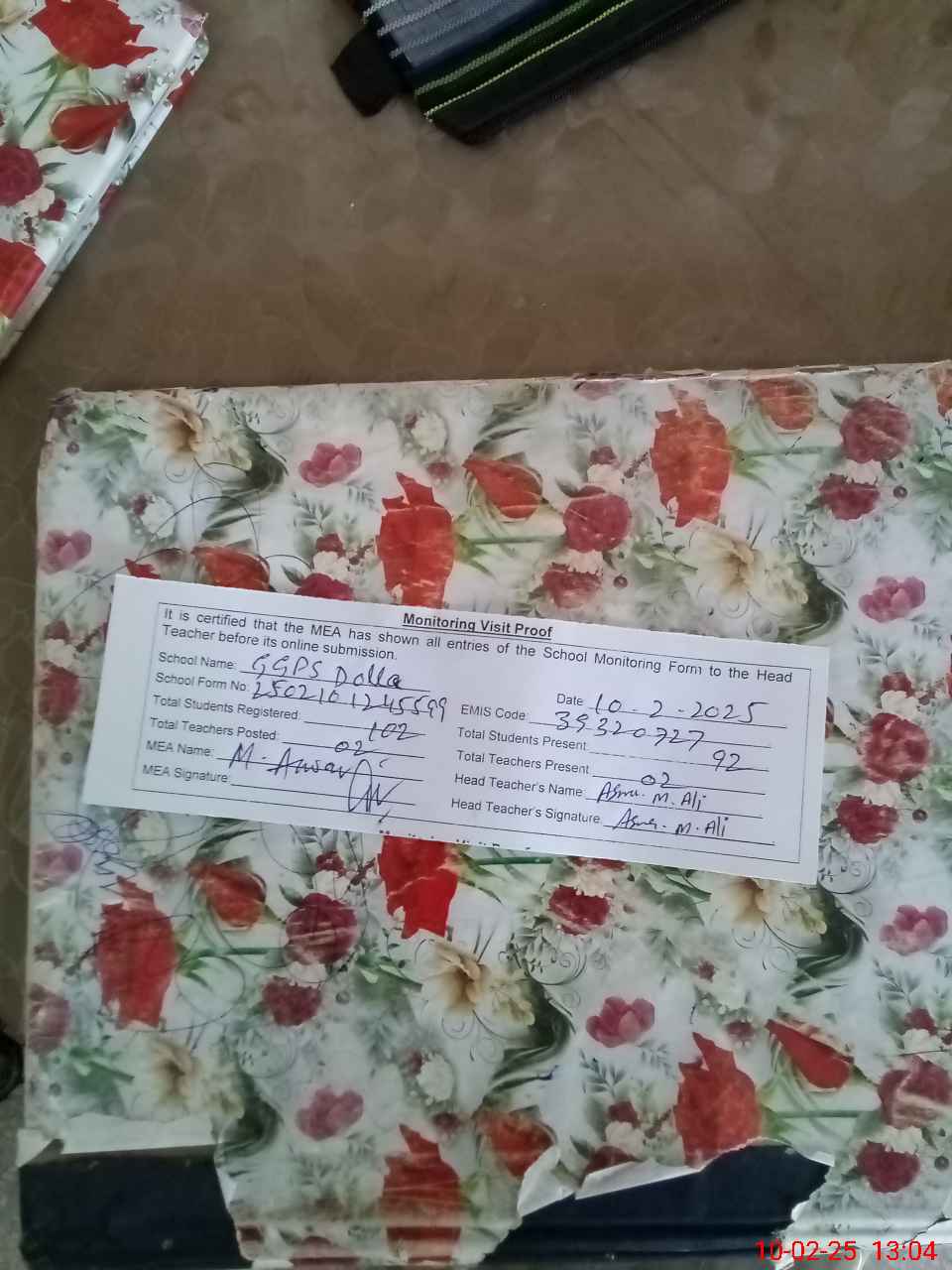 | Attendance Register | Head Teacher | MEA with School | Visit Proof |