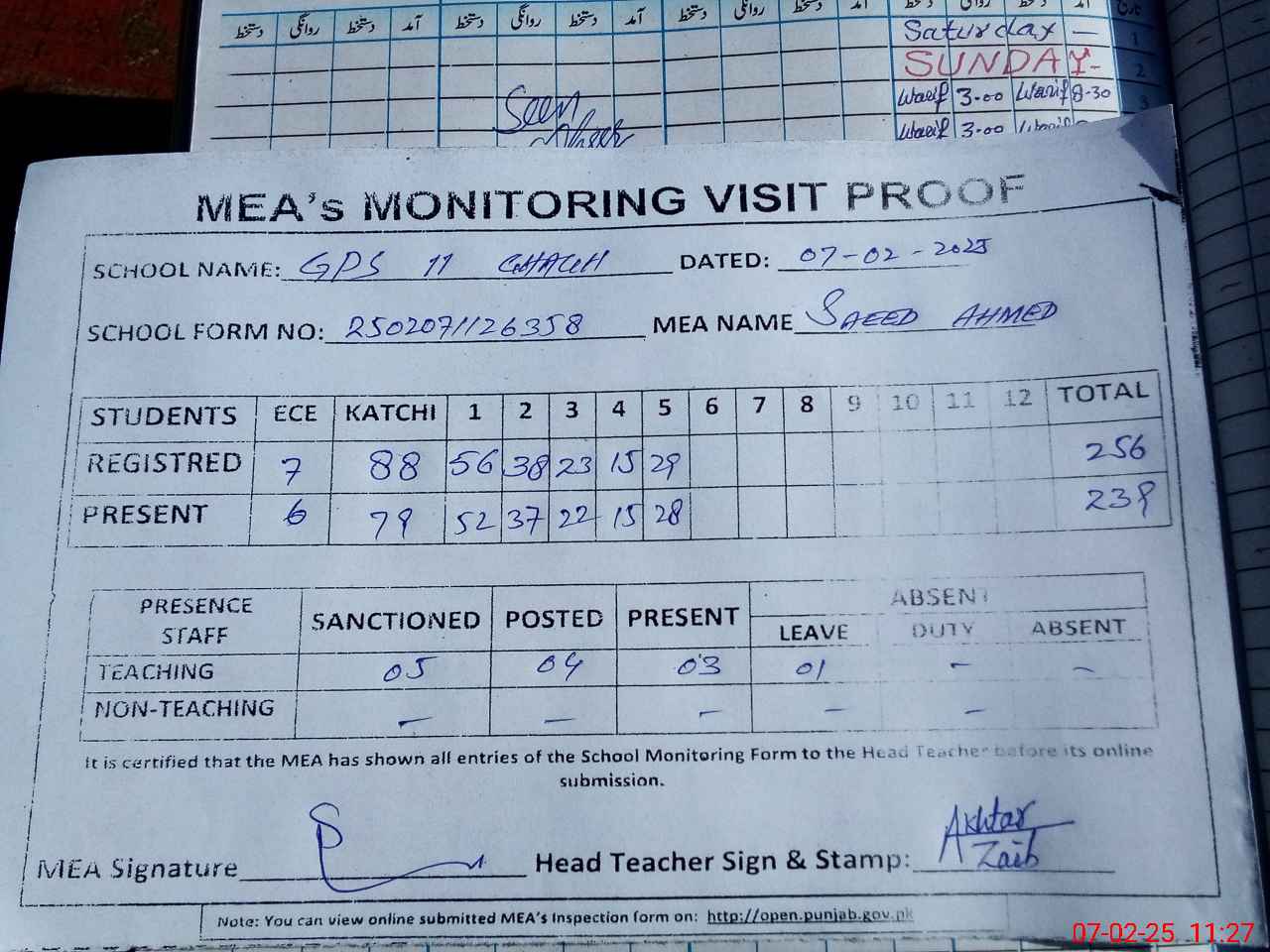| Attendance Register | Head Teacher | MEA with School | Visit Proof |