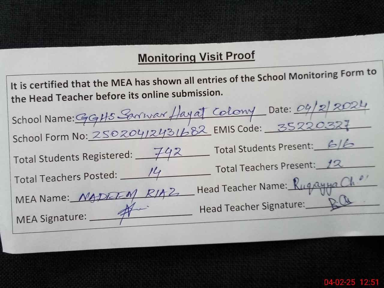 | EMIS Code: 35220327 | Name of School: GGHS SARWAR HAYAT COLONY (Newly upgraded) | |||