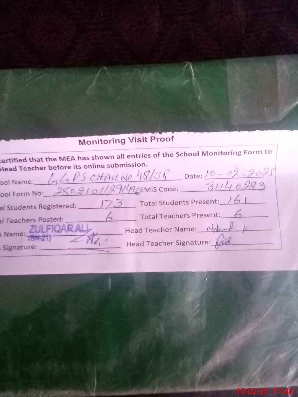 | Attendance Register | Head Teacher | MEA with School | Visit Proof |