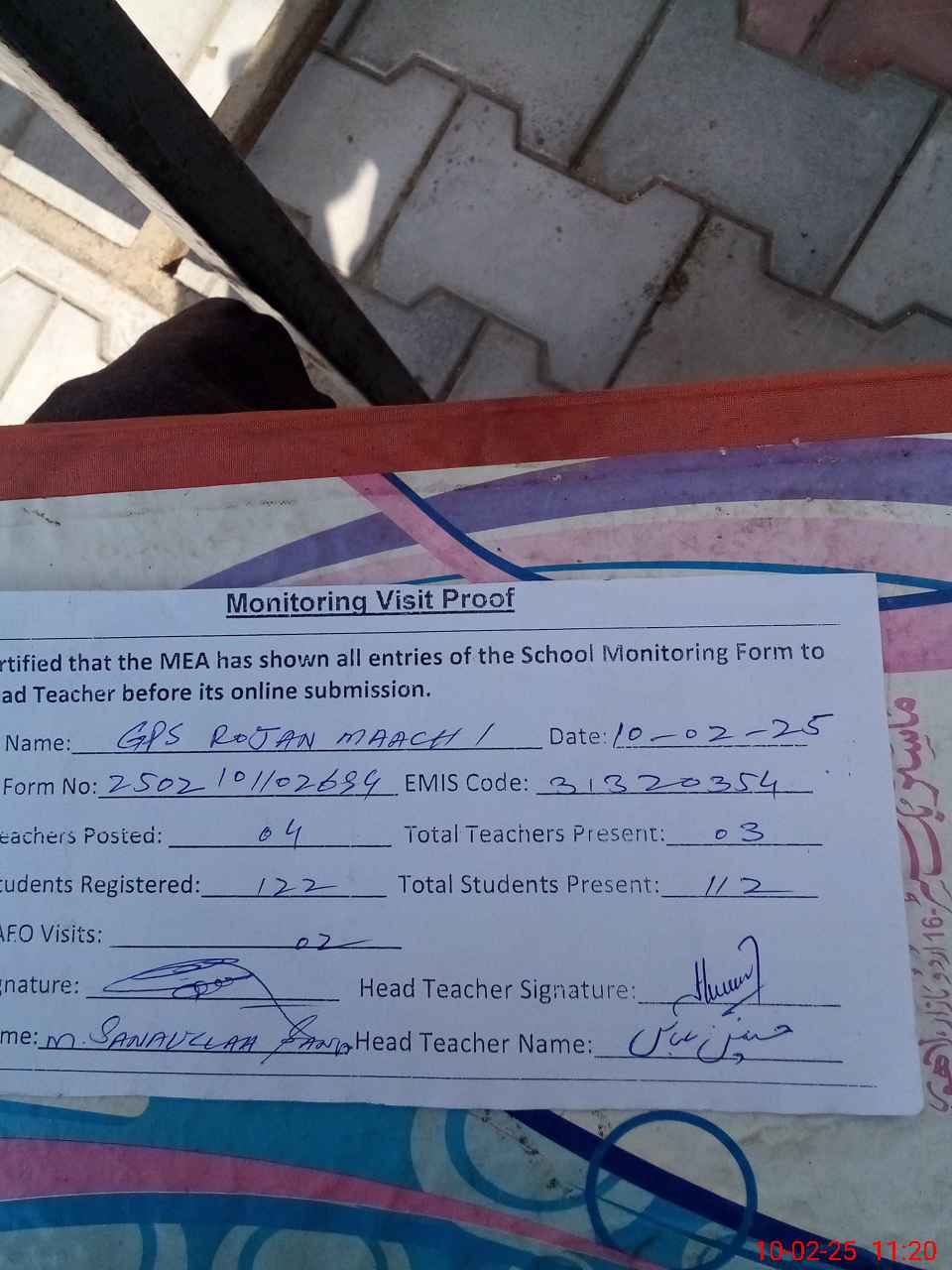 | Monitoring Date: 10-02-2025 | Start Time: 10-02-2025 11:02 AM | End Time: 10-02-2025 11:20 AM | Name of MEA: Mu**** Sa**** Ul**** Sa**** | |