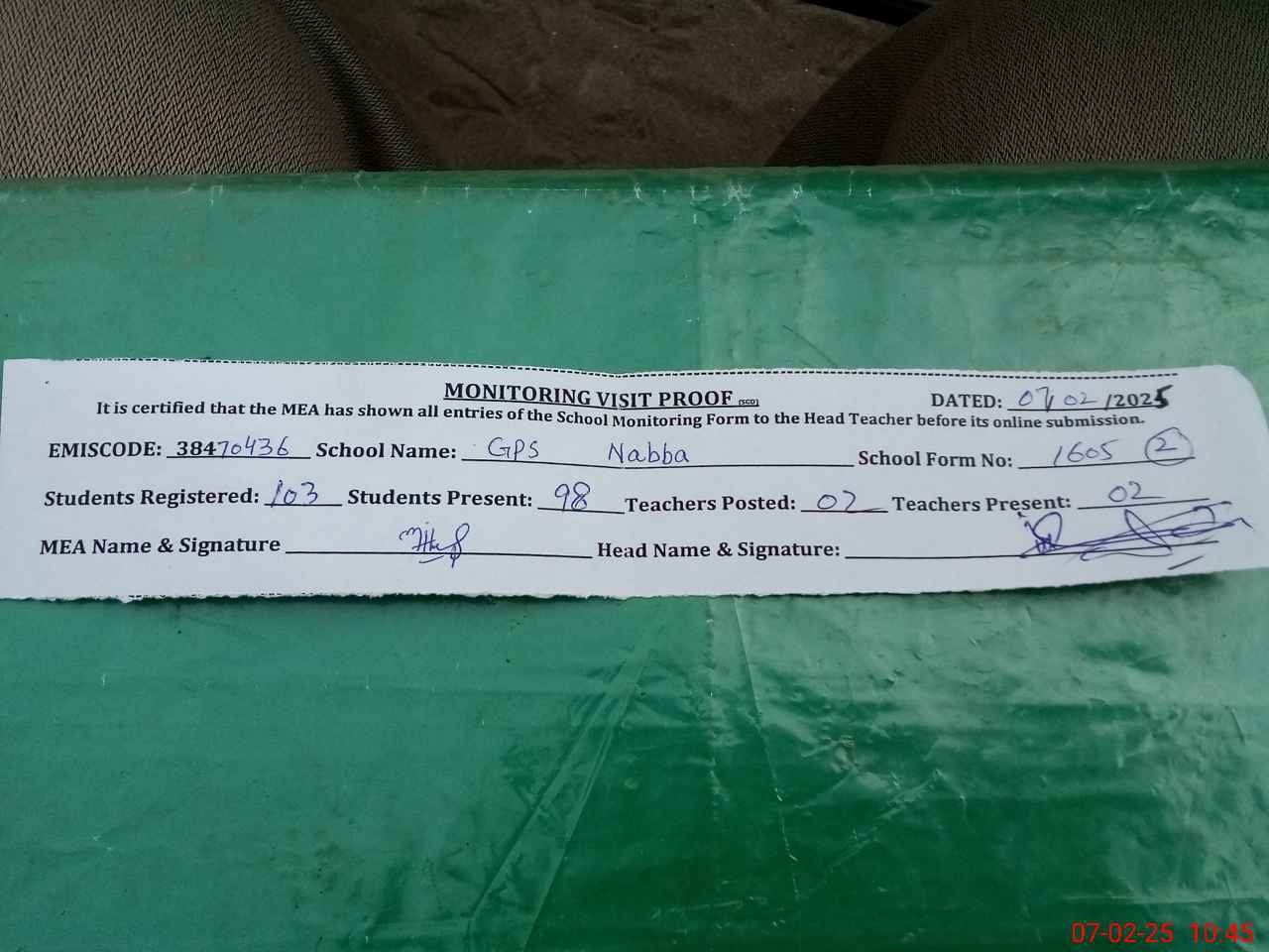 | Attendance Register | Head Teacher | MEA with School | Visit Proof |