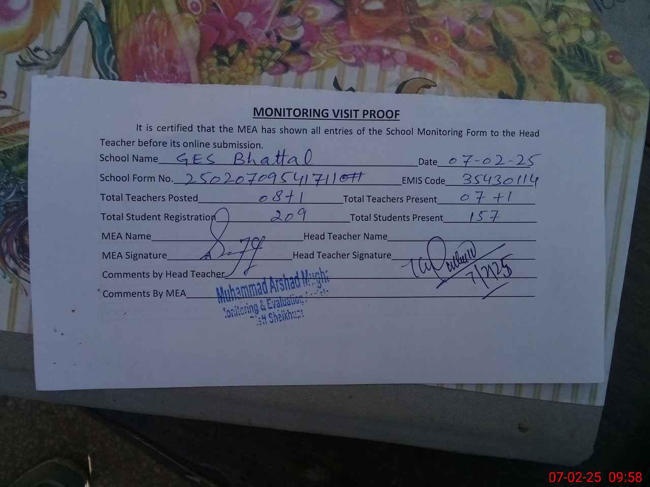 | Attendance Register | Head Teacher | MEA with School | Visit Proof |