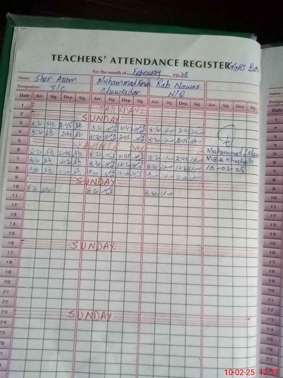 | CNIC | Full Name | Designation | R/C | Absence During Last Calender Month |