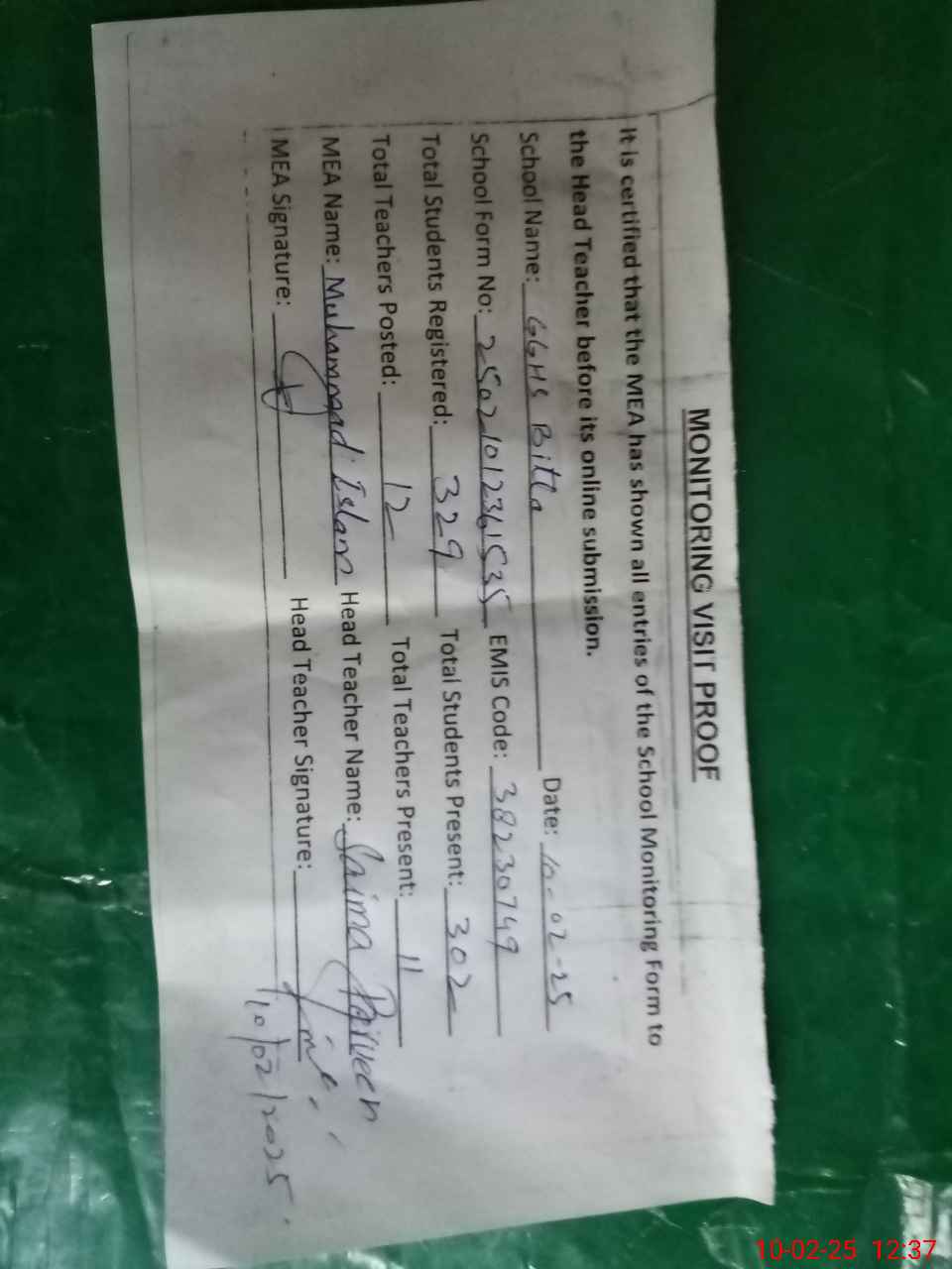 | Attendance Register | Head Teacher | MEA with School | Visit Proof |