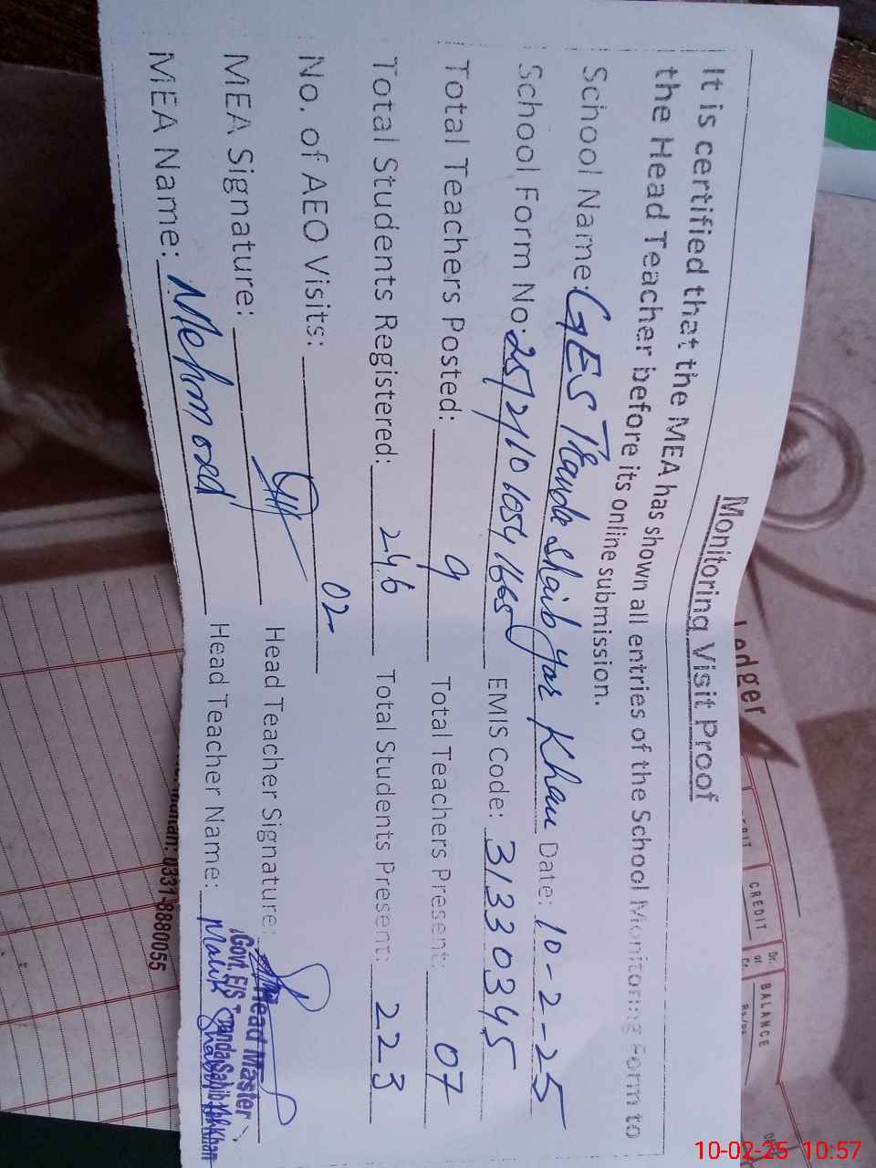 | Monitoring Date: 10-02-2025 | Start Time: 10-02-2025 10:21 AM | End Time: 10-02-2025 10:57 AM | Name of MEA: Ma**** UlHa**** | |