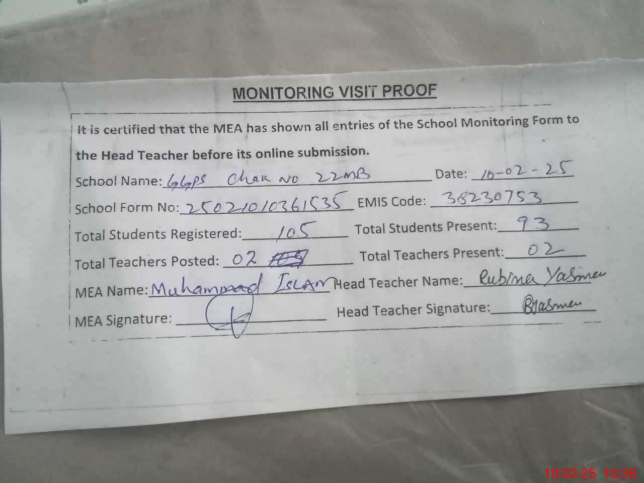 | Attendance Register | Head Teacher | MEA with School | Visit Proof |