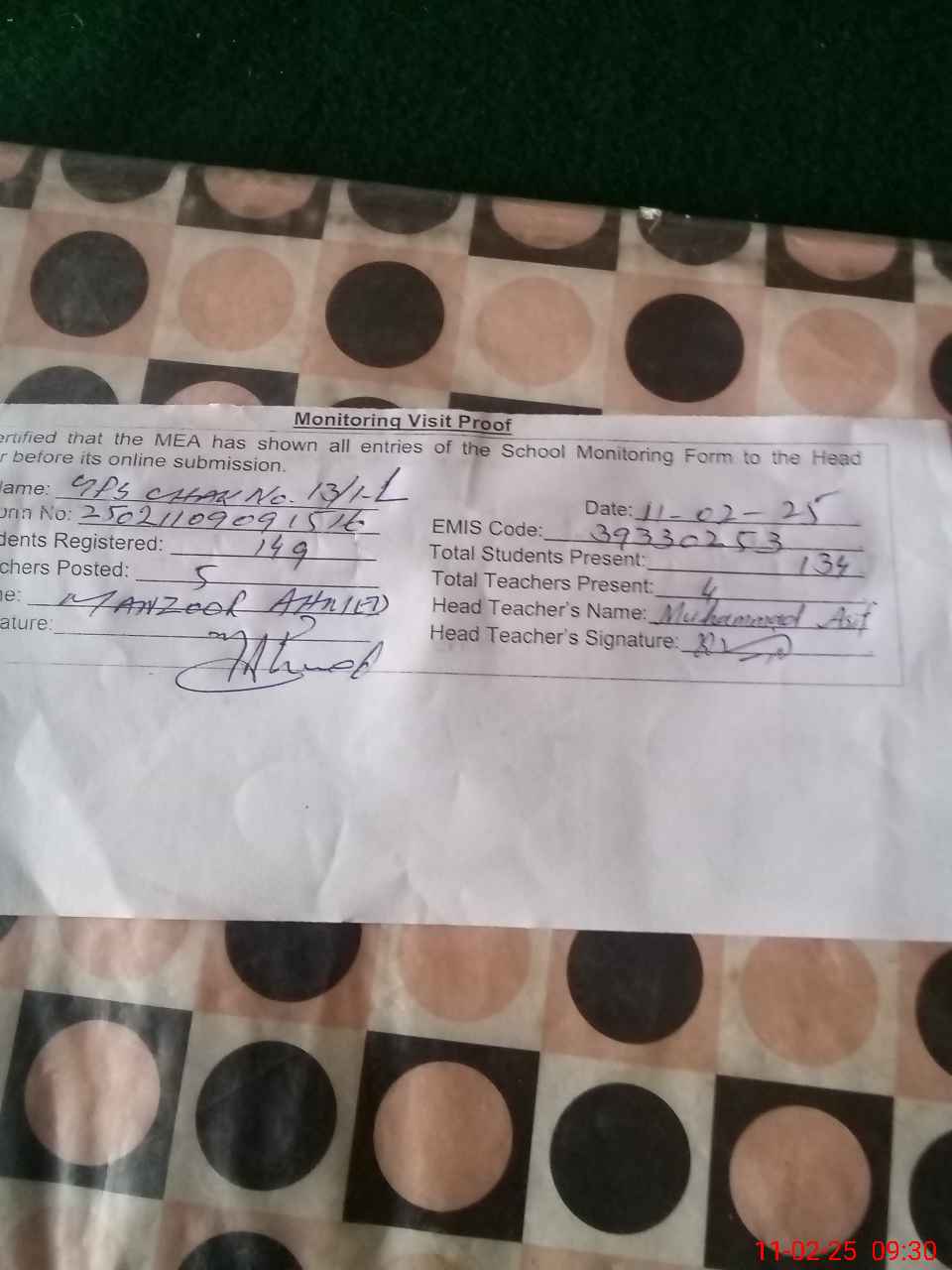 | Certified that this School was Inspected by the Undersigned MEA/DMO Today and the Information Stated Above is as Per Record. | |||||