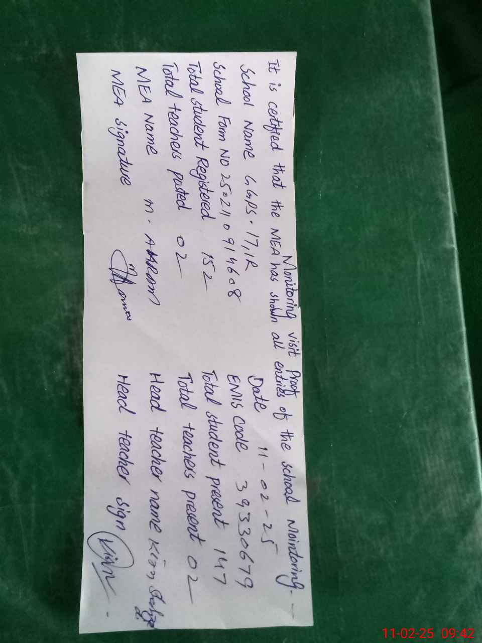 | Attendance Register | Head Teacher | MEA with School | Visit Proof |