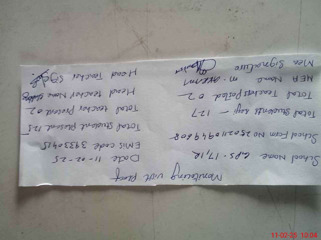 | Attendance Register | Head Teacher | MEA with School | Visit Proof |
