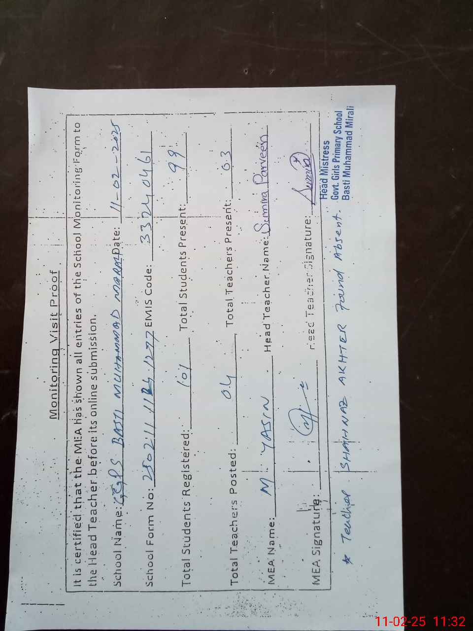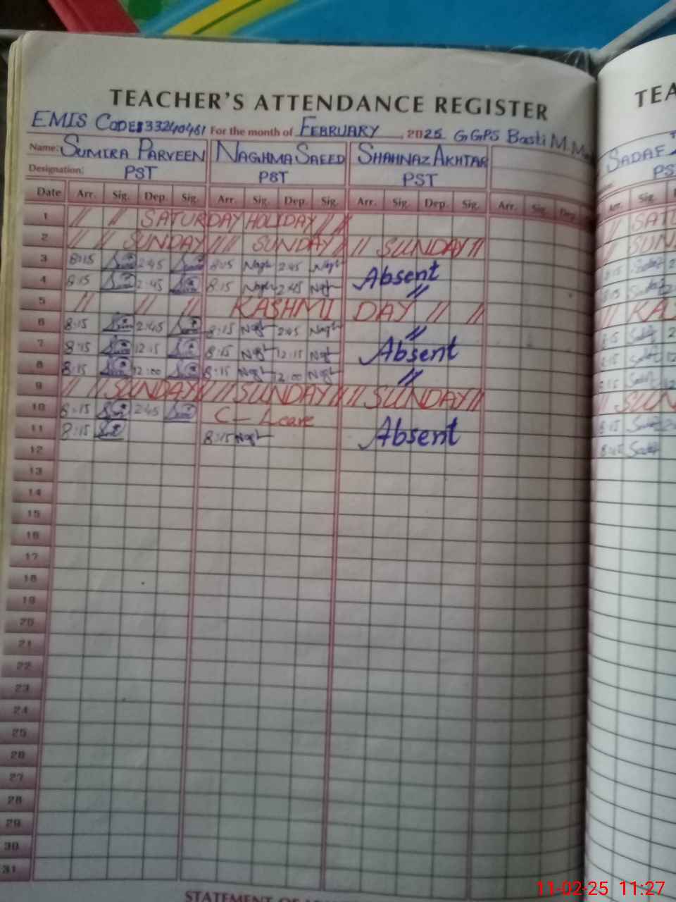 | Remarks (Use Separate Page if Required): Teacher SHAHNAZ AKHTER found absent since 20th January 2025 till date now Head teacher failed to produce recommended her leave NSB record not updated accordingly | |||||