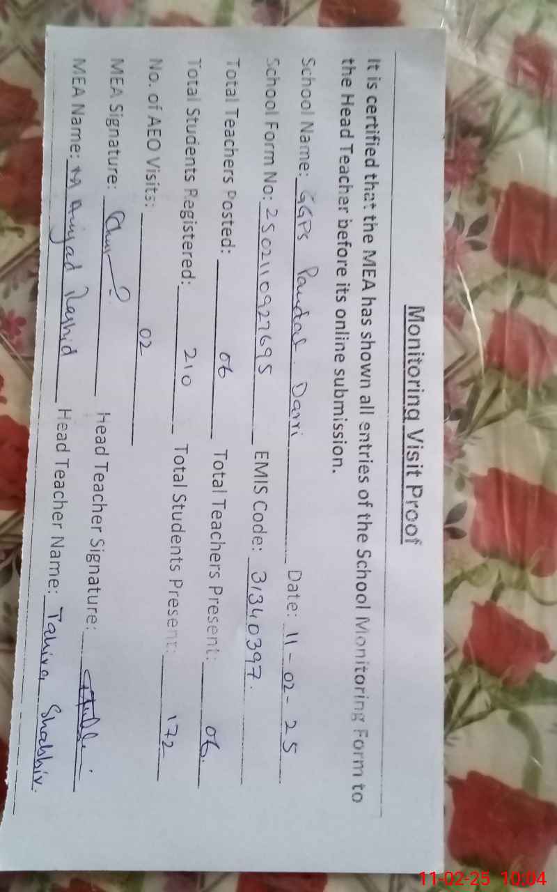 | Attendance Register | Head Teacher | MEA with School | Visit Proof |