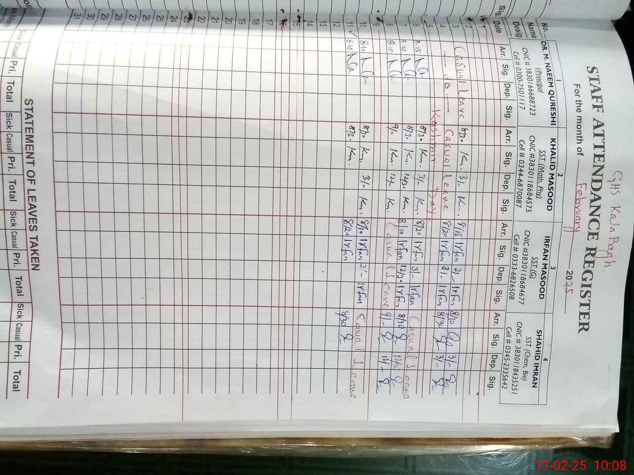 | CNIC | Full Name | Designation | R/C | Absence during last cal. month |