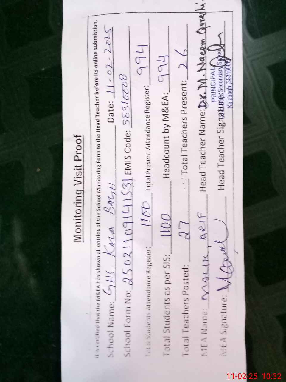 | Attendance Register | Head Teacher | MEA with School | Visit Proof |