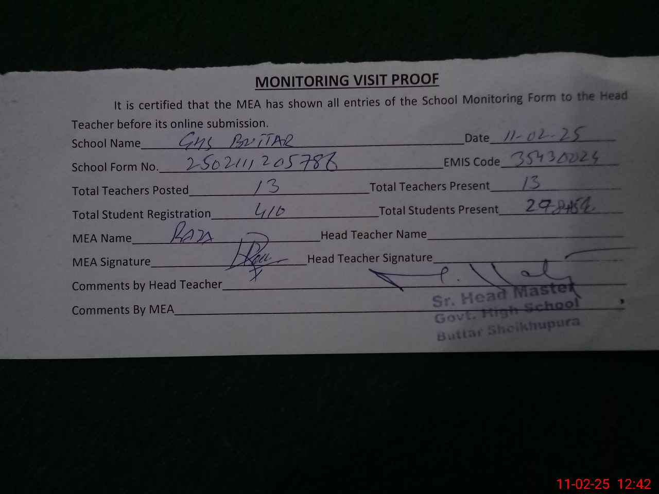 | Attendance Register | Head Teacher | MEA with School | Visit Proof |